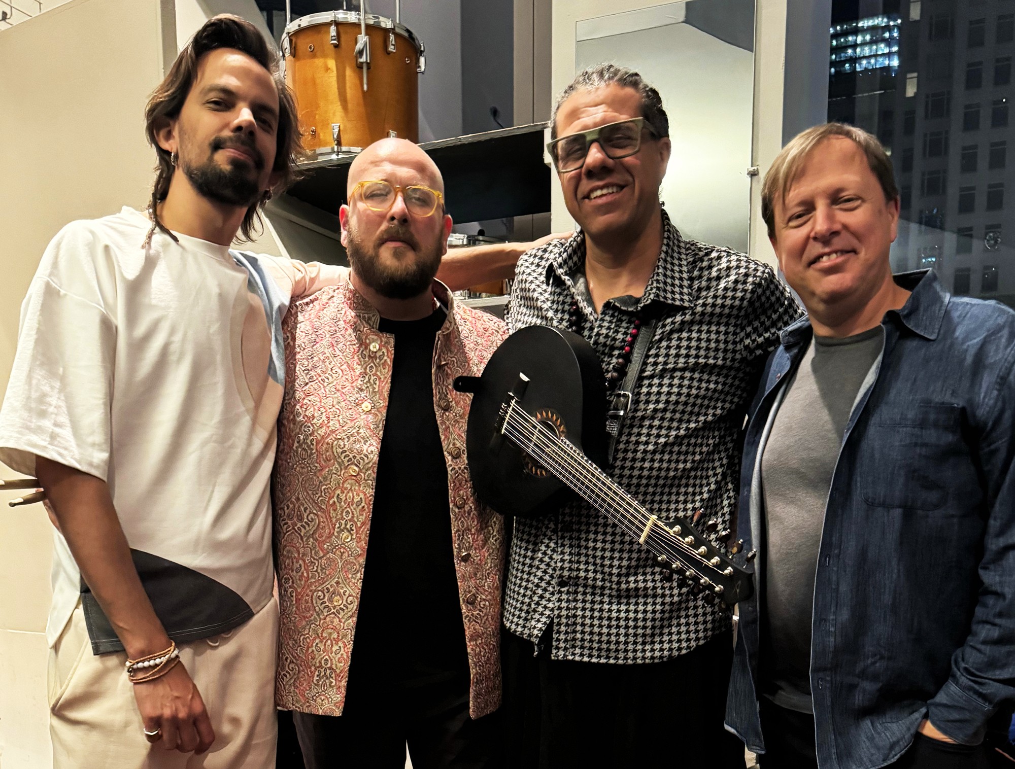 Salomão Soares (à esquerda), Thiago Big Rabello, Hamilton de Holanda (de óculos) e Chris Potter (à direita) posam no camarim do Dizzy’s Club