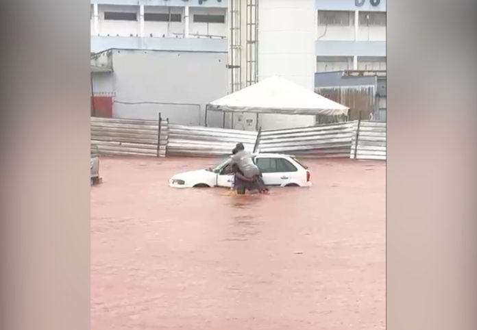 O carro do idoso acabou ilhado durante enxurrada no centro da cidade