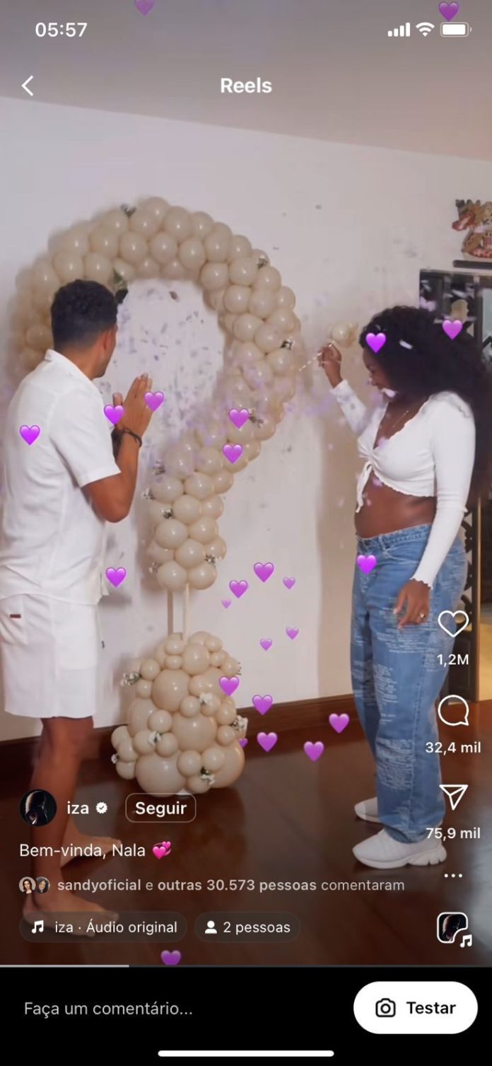 A cantora Iza e o jogador de futebol Yuri Lima, do Mirassol, descobriram que esperam uma menina. Na noite de segunda-feira (13), eles divulgaram um vídeo do chá revelação, após estourarem um balão, que revelou confetes na cor rosa.